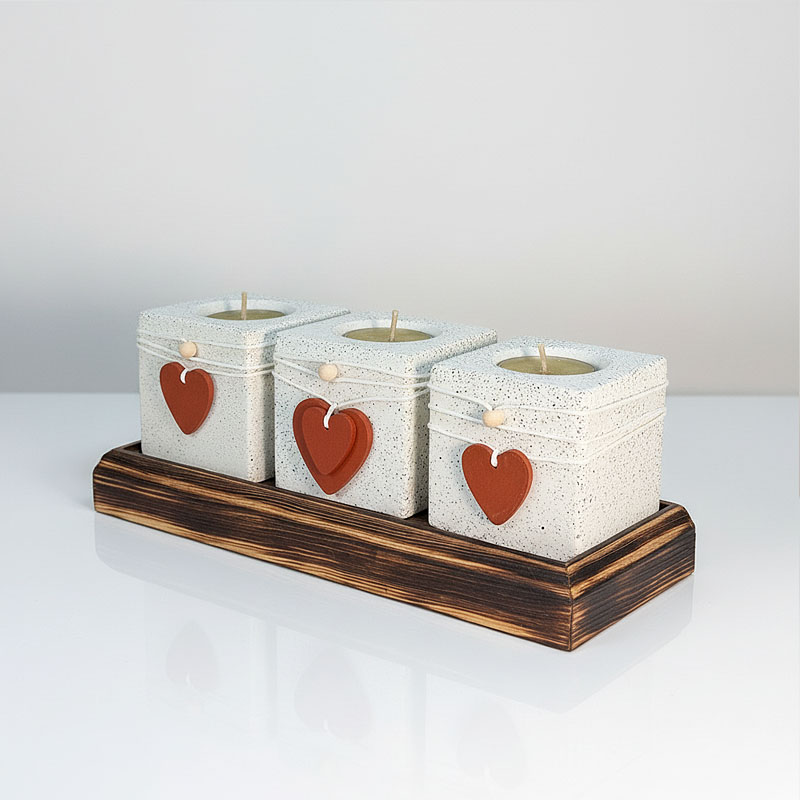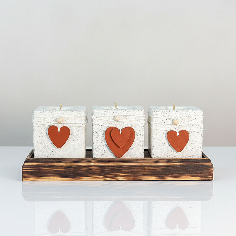 Zestaw trzech ręcznie wykonanych świeczników z jasnego betonu, ozdobionych koralowymi sercami i naturalnym sznurkiem. Ustawione na solidnej, opalanej podstawie z drewna, tworzą harmonijną kompozycję, która łączy surowość betonu z ciepłem naturalnych materiałów. To delikatna dekoracja do wnętrz w stylu rustykalnym i ekologicznym – idealna na prezent lub jako akcent codziennego spokoju.