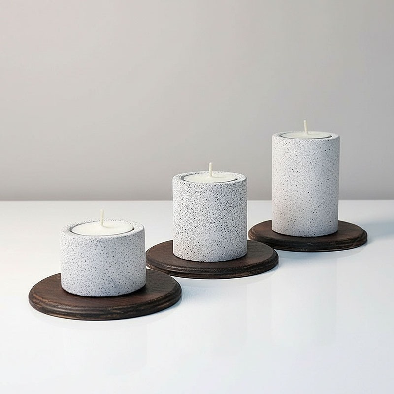 - Trzy betonowe świeczniki z jasnoszarego betonu . Ich powierzchnia ma delikatną, ziarnistą fakturę i naturalne nakrapianie, które powstaje dzięki dodatkowi piasku kwarcowego. W skład zestawu wchodzą okrągłe podstawki.