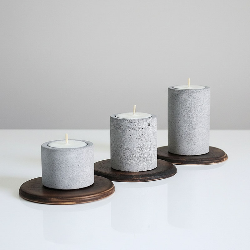 - Minimalistyczny zestaw trzech betonowych świeczników na drewnianych podstawkach. Prosty, a zarazem elegancki – sprawdzi się w każdym wnętrzu, dodając ciepłego blasku i przytulnego klimatu.
