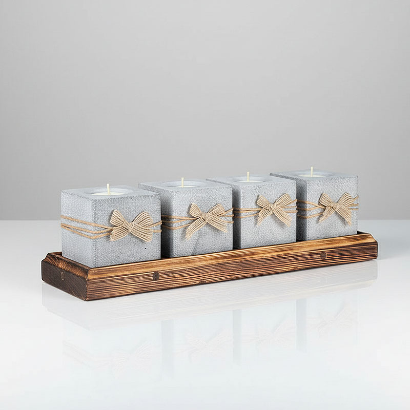 Cztery betonowe świeczniki na opalanej drewnianej podstawie, ozdobione jutową kokardką, tworzą zestaw o wyjątkowo przytulnym, rustykalnym charakterze. Proste formy i naturalne materiały nadają całości swobodny, domowy klimat – idealny do wnętrz w stylu boho, wiejskim lub klasycznym. Lekko szorstka faktura betonu kontrastuje z gładką powierzchnią drewna, a ręczne wykonanie sprawia, że każdy egzemplarz ma swój niepowtarzalny wygląd.