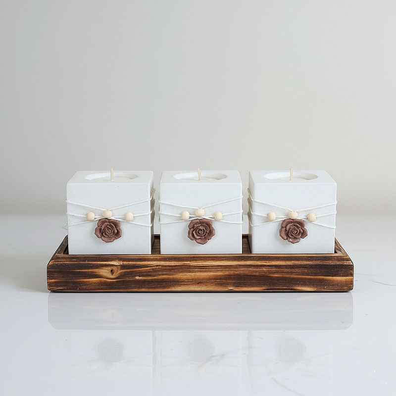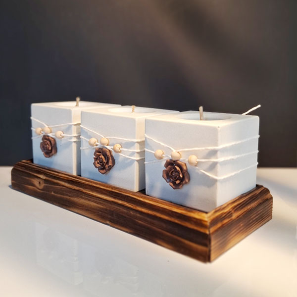 Zestaw trzech ręcznie wykonanych świeczników z betonu, ozdobionych delikatnymi różami i naturalnym sznurkiem. Ustawione na opalanej drewnianej podstawie, łączą trwałość betonu z subtelnym, dekoracyjnym akcentem. Idealne do wnętrz w stylu rustykalnym, boho i minimalistycznym, a także jako wyjątkowy prezent.