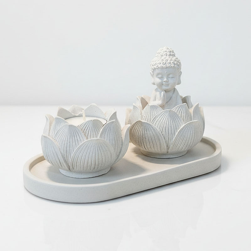 W zestawie znajdziesz dwa świeczniki w formie lotosu oraz figurkę Buddy, którą możesz ustawić obok lub pozostawić w lotosie, dostosowując aranżację do swojego nastroju. W zagłębieniach lotosów znajdzie się miejsce na standardowe tealighty – ich płomień rozświetli Twoje wieczory medytacji, sesje jogi lub po prostu chwile relaksu z książką.